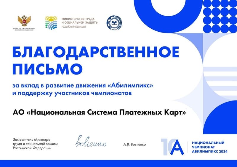В 2024 году АО «НСПК» стало партнёром Национального чемпионата по профессиональному мастерству среди инвалидов и лиц с ограниченными возможностями здоровья «Абилимпикс».